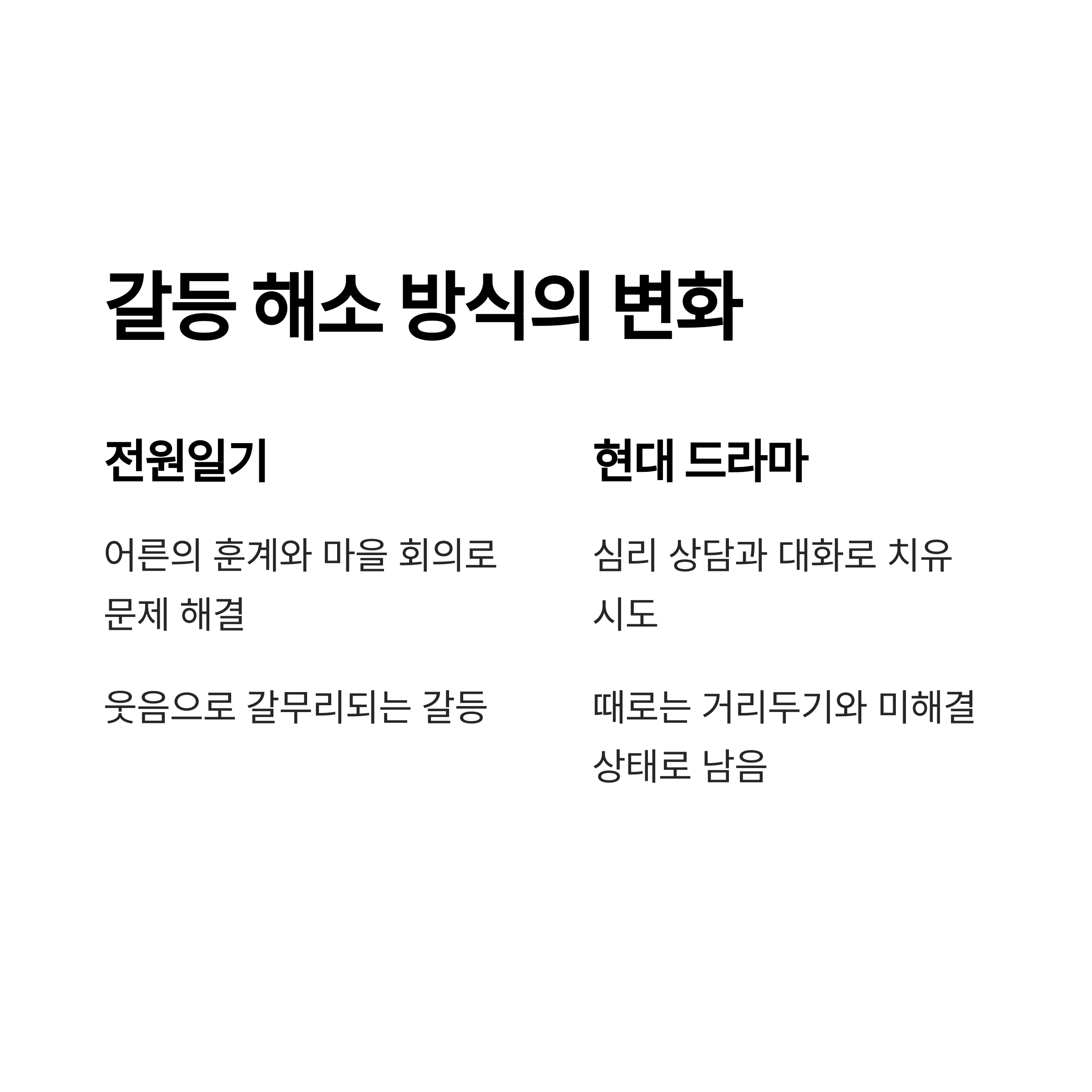 | 갈등 해소 방식 | 어른 중심 화해, 공동체의 조화 | 개인적 치유, 거리두기, 때로는 미해결 |