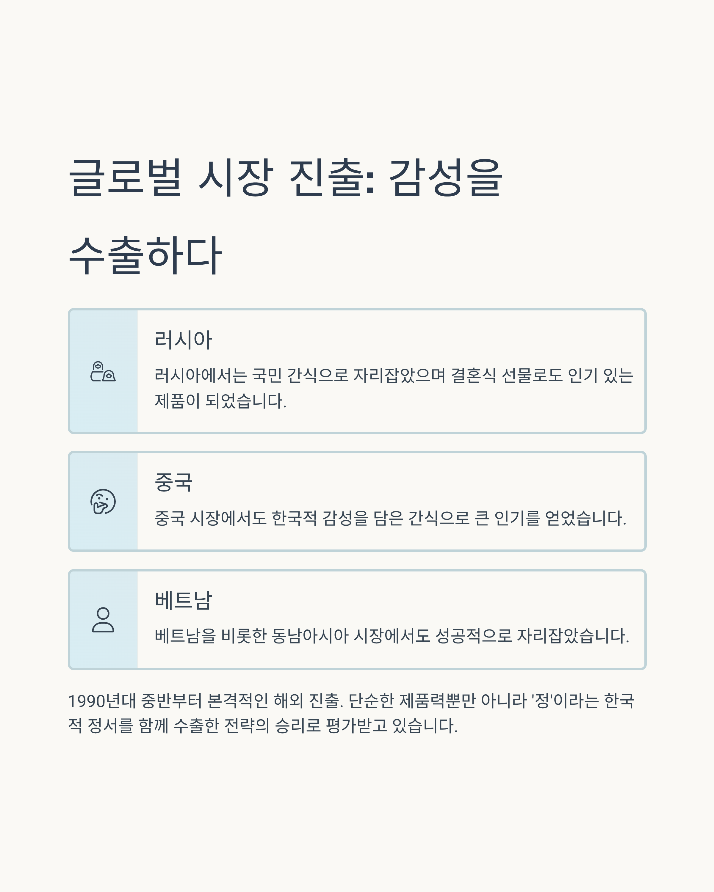 해외 시장에 본격적으로 진출합니다. 특히 러시아에서는 국민 간식으로 자리잡았으며