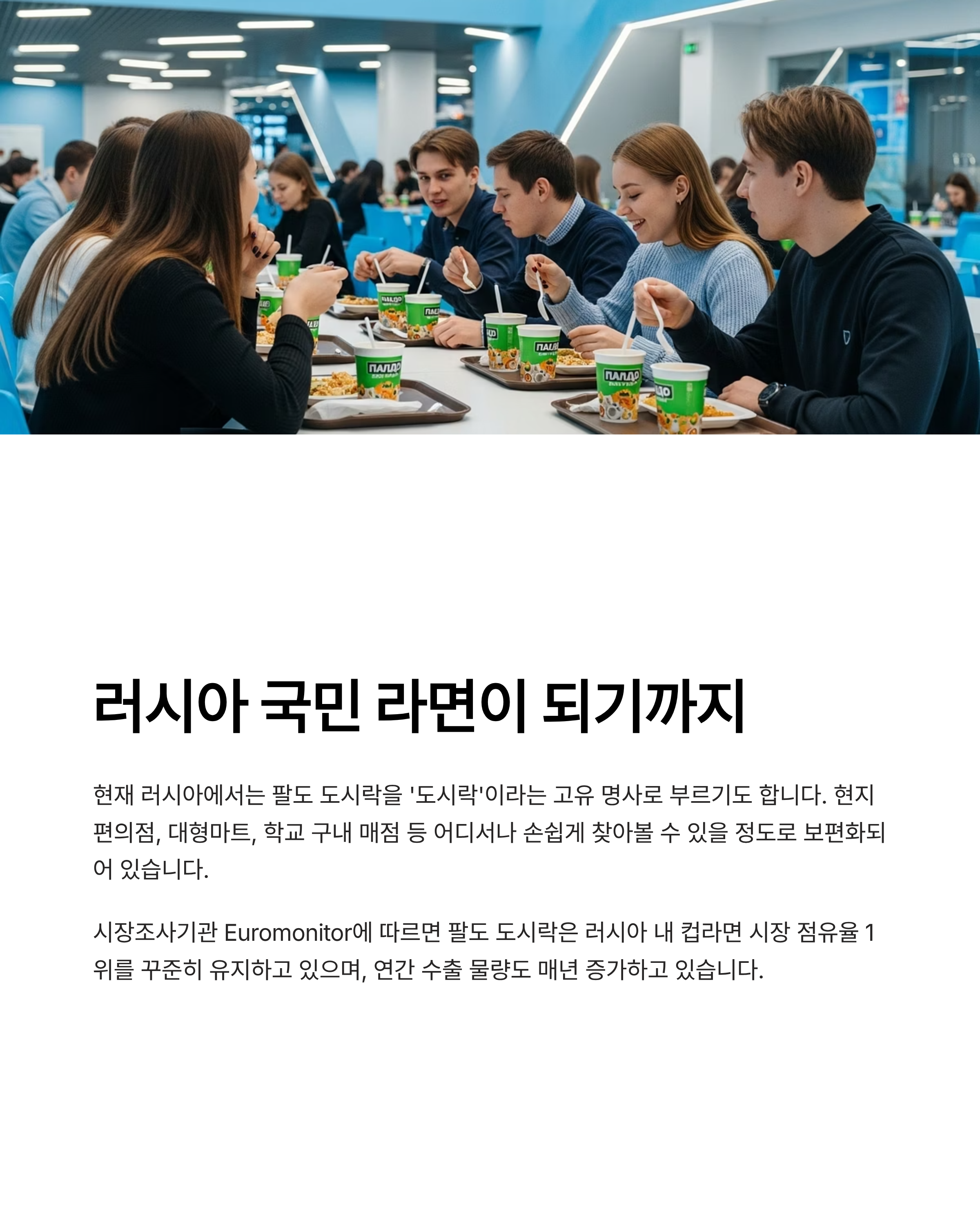 현재 러시아에서는 팔도 도시락을 ‘도시락’이라는 고유 명사로 부르기도 합니다.
