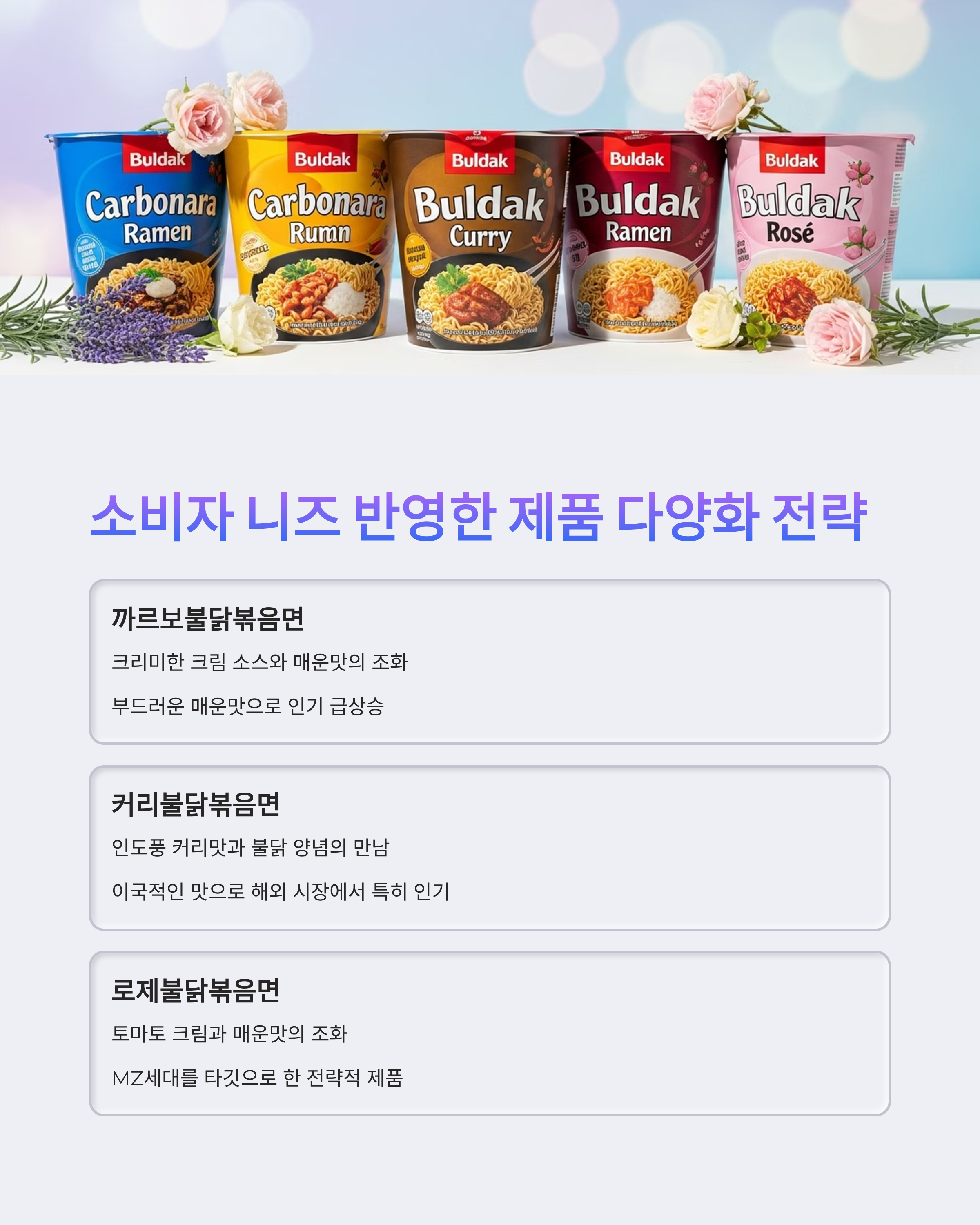 | 로제불닭볶음면 | 토마토 크림과 매운맛의 조화 | MZ세대 타깃 인기 |
