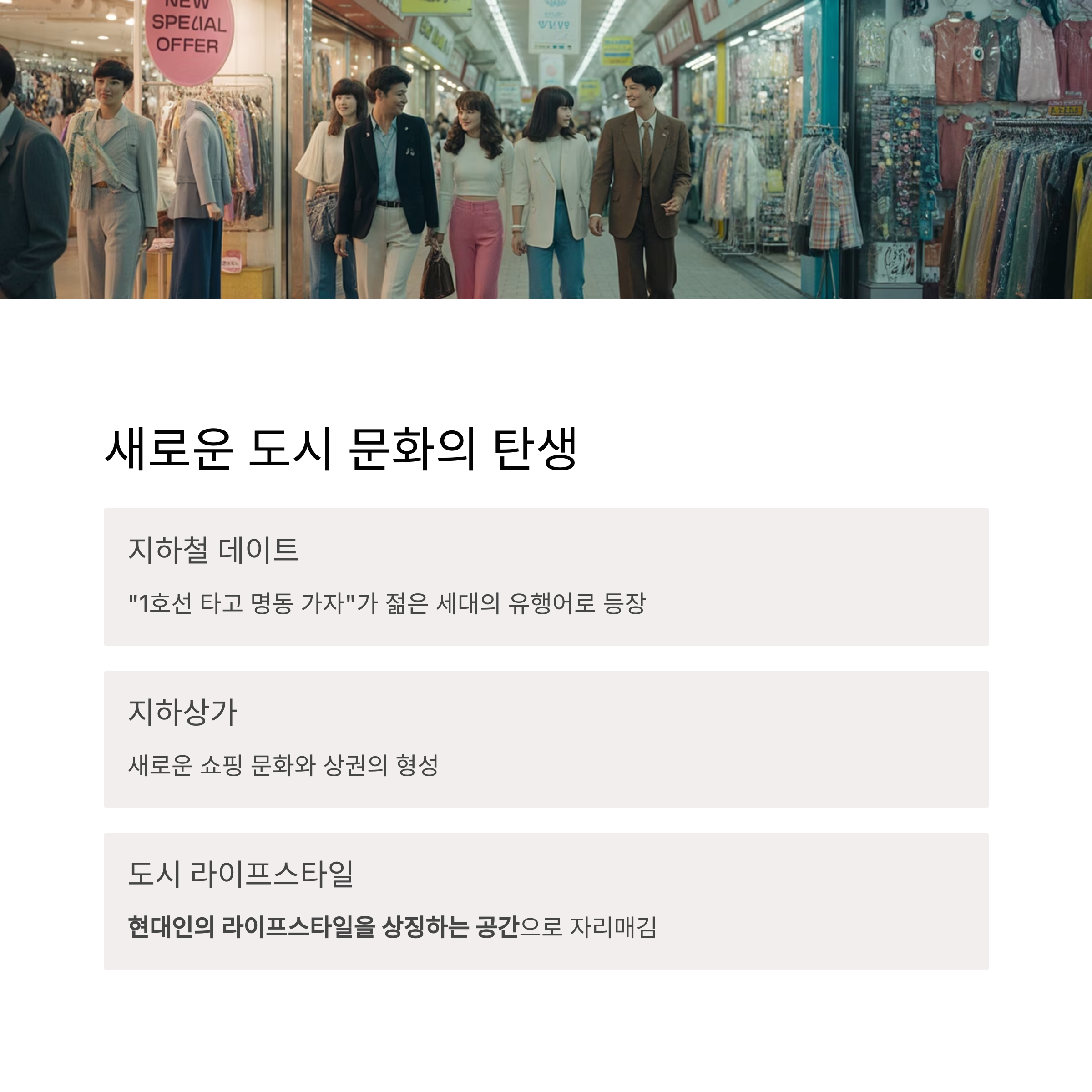 지하철 광고, 지하상가, 전자시계, 도심 패션이 1호선의 플랫폼에서 시작되었고