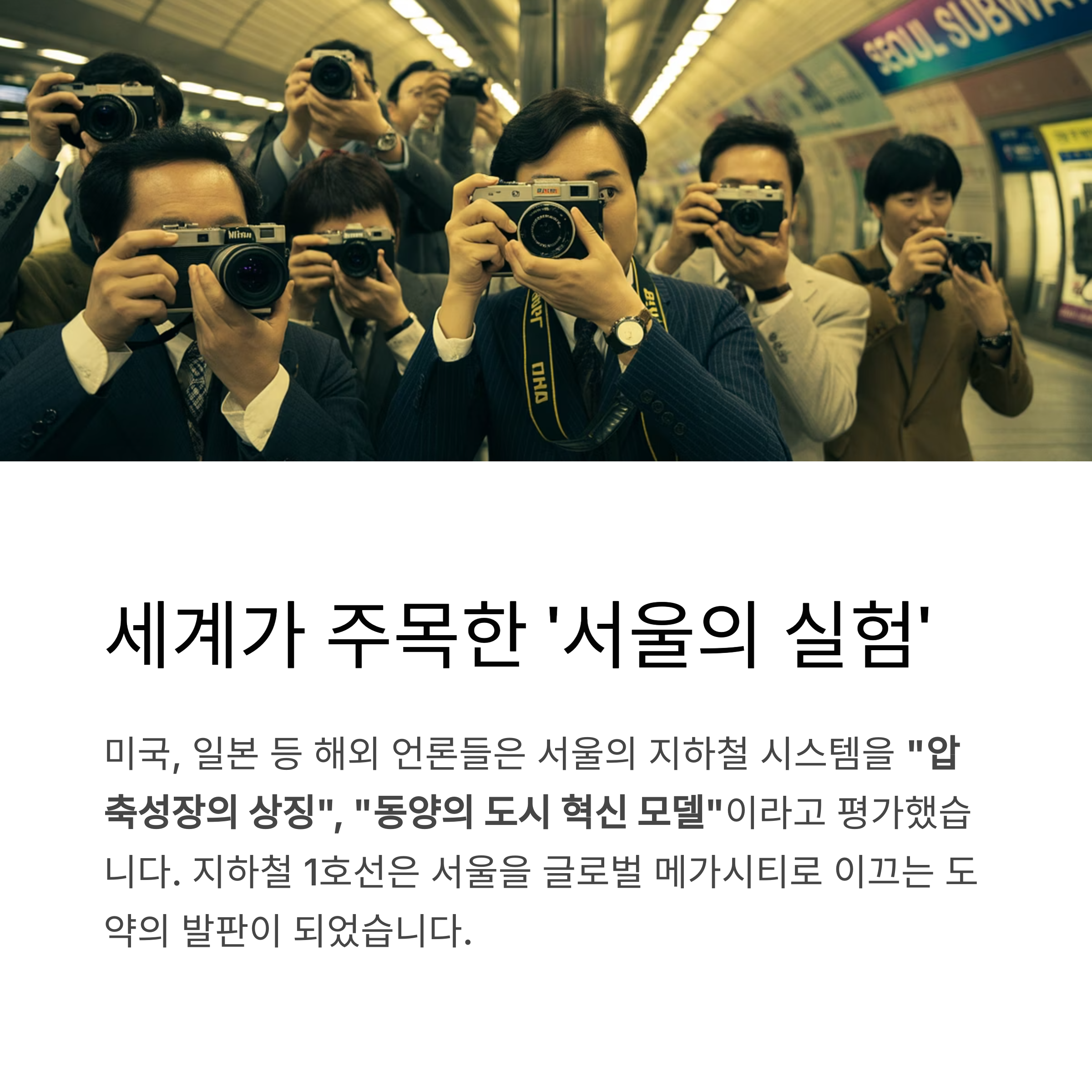 지하철 1호선은 서울을 글로벌 메가시티의 길로 이끄는 도약의 발판이 되었습니다.
