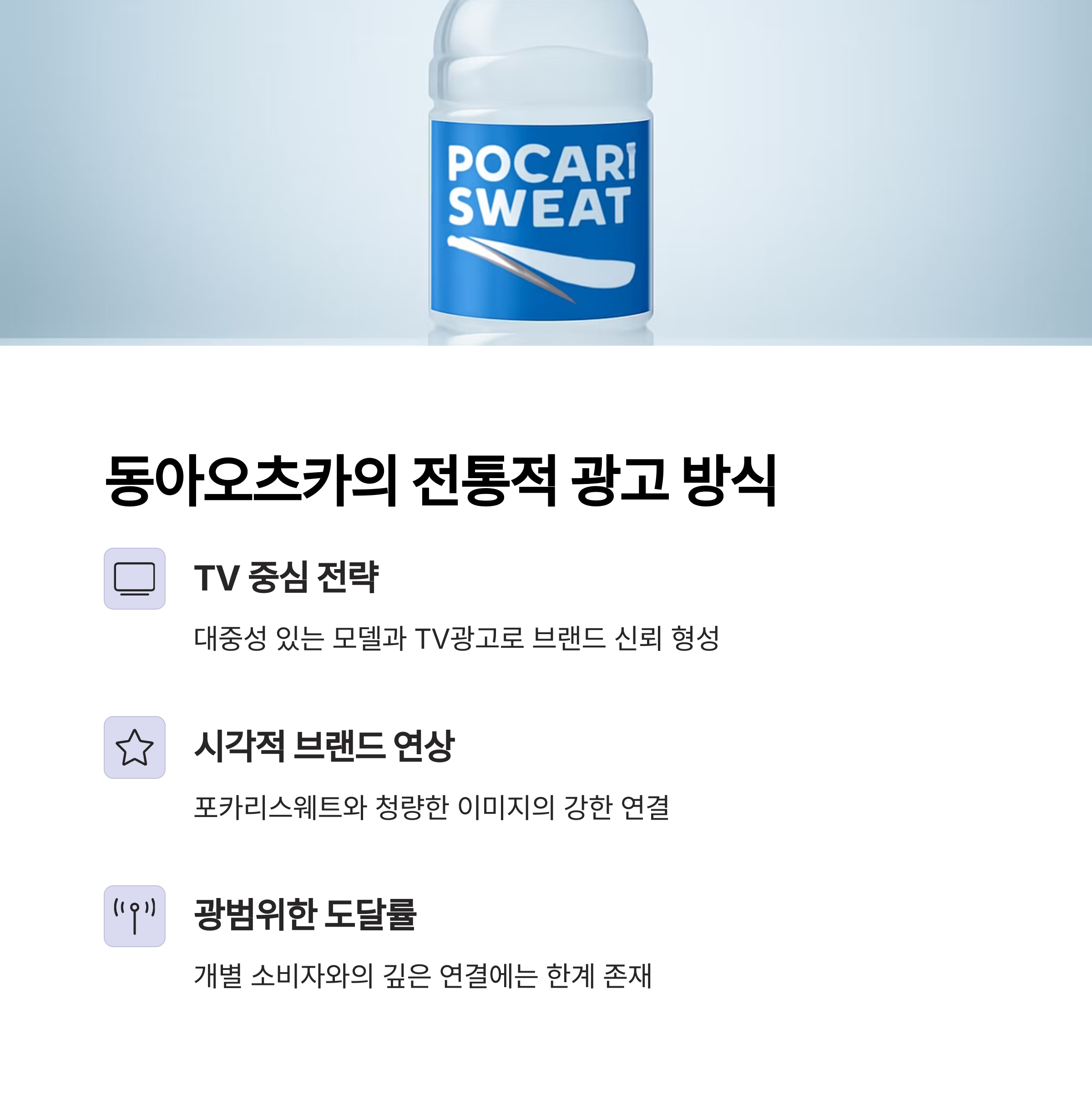 동아오츠카는 오랜 시간 동안 대중성 있는 모델 기용과 TV광고 중심의 전략을 고수해왔습니다.