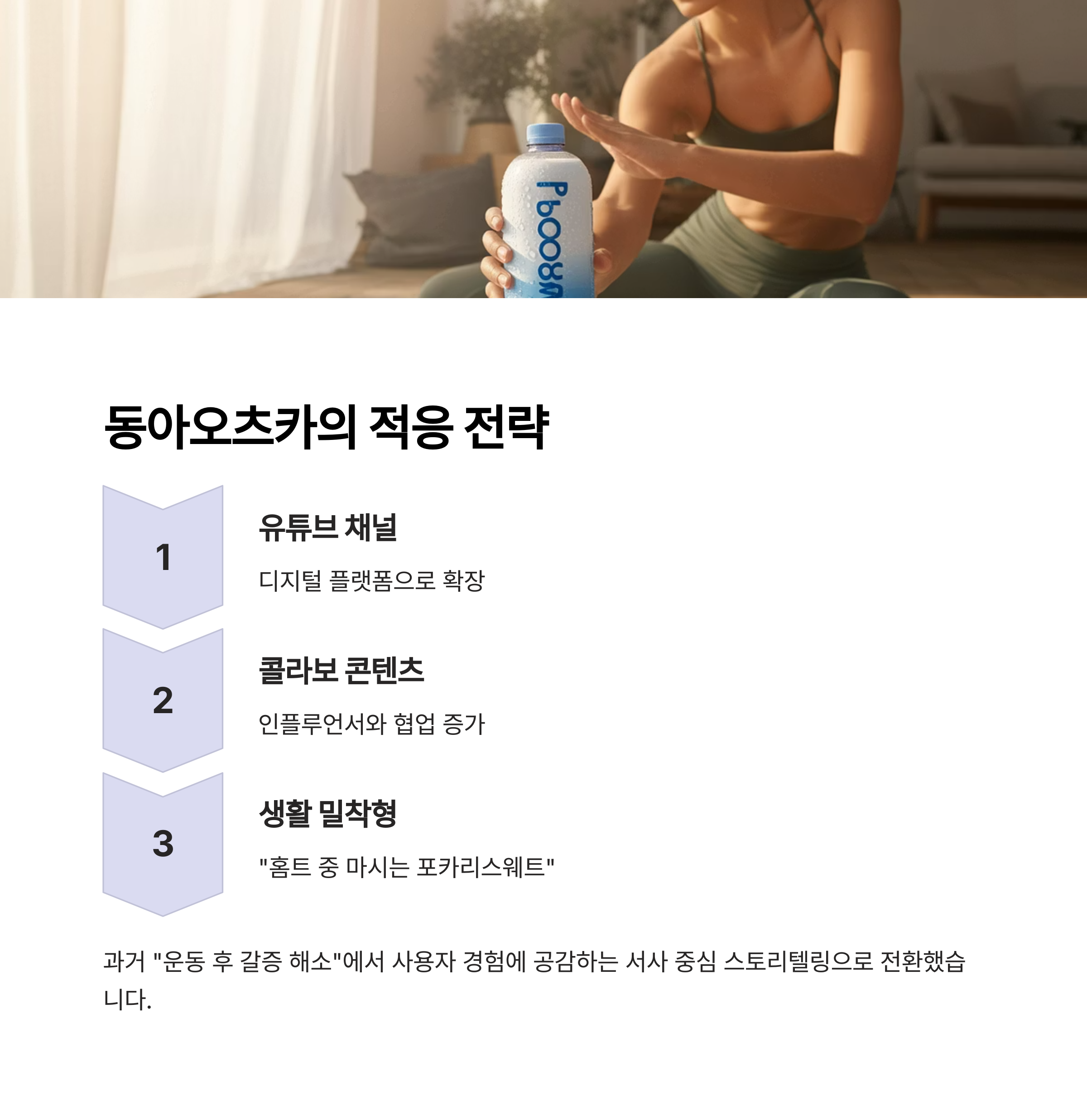 "홈트 중 마시는 포카리스웨트" 같은 생활 밀착형 콘텐츠를 선보이고 있습니다.
